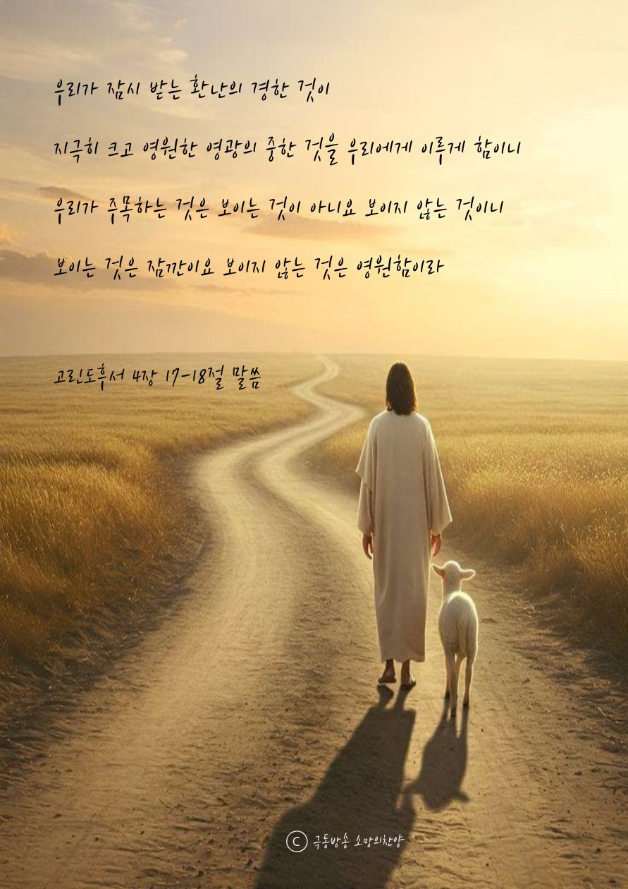 오늘 우리 마음의 중심에 두고 싶은 말씀은 고린도후서 4장 17절과 18절 말씀입니다.