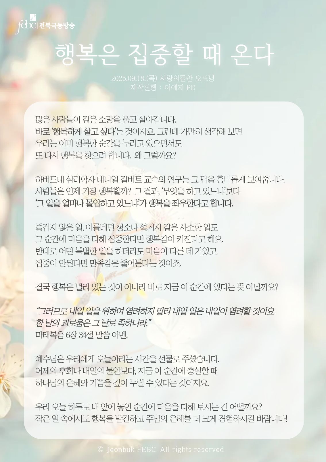 [전북] 25.09.18.(목) 사랑의뜰안 오프닝 "행복은 집중할 때 온다"
